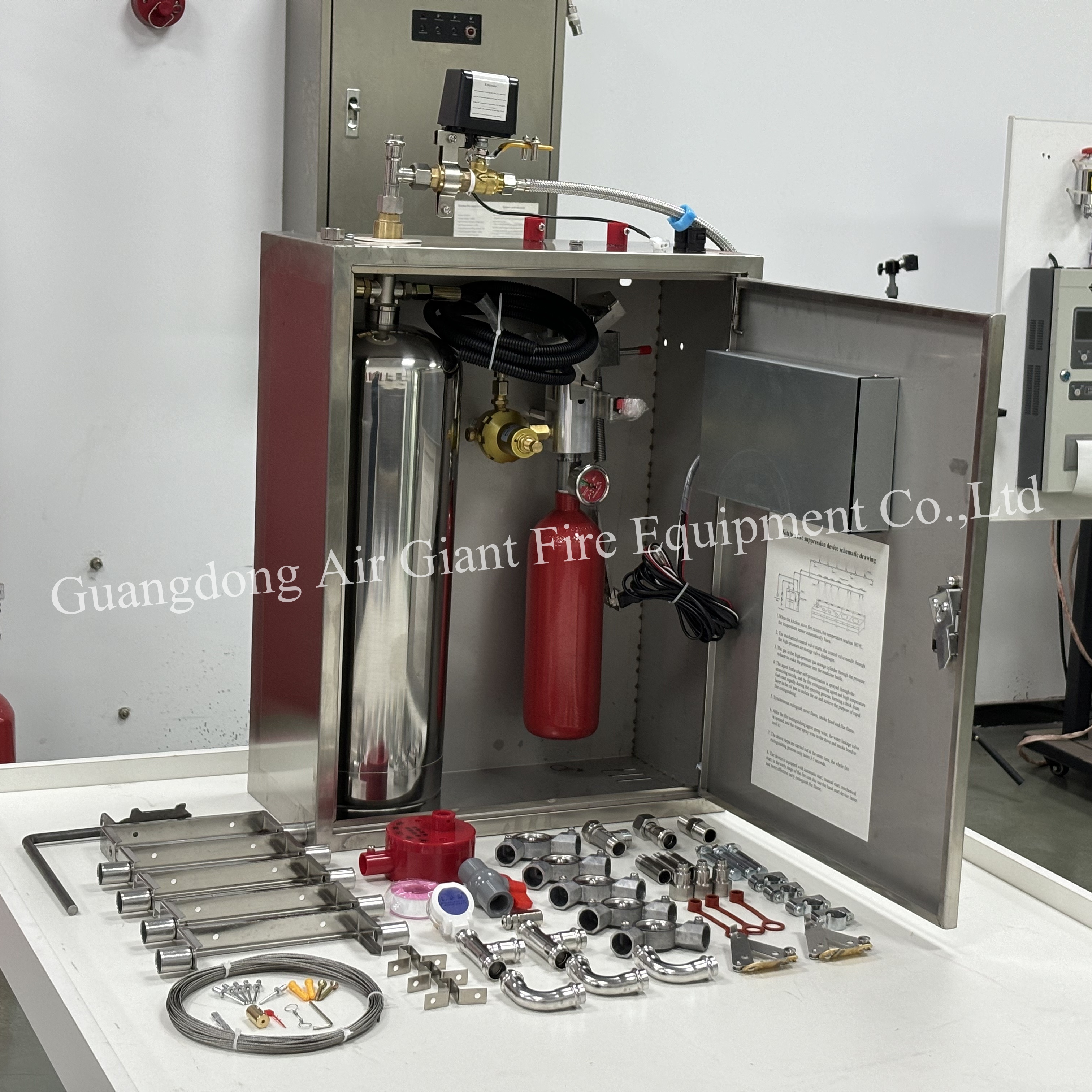 Это устройство может осуществлять автоматический мониторинг, обнаружение и активацию 24 часа в сутки, с коротким временем распыления огнетушащего вещества и быстрым тушением в течение 5 секунд. Во время тушения пожара горящее масло не разбрызгивается. Этот продукт запускается механически и не требует электричества. Для предотвращения коррозии все сырье изготовлено из нержавеющей стали или меди. При установке и использовании он не занимает площадь кухни, а только пространство и положение. Установка количества и положения форсунок гибкая и соответствует требованиям спецификаций. Проектирование и установка на месте выполняются в соответствии с количеством отверстий для огня на плите. Экологически чистое огнетушащее вещество, легко очищается и удобно для ежедневной уборки. В то же время устройство пожаротушения устанавливается на окружающих стенах защитной зоны, что не занимает пространство на земле защитной зоны.