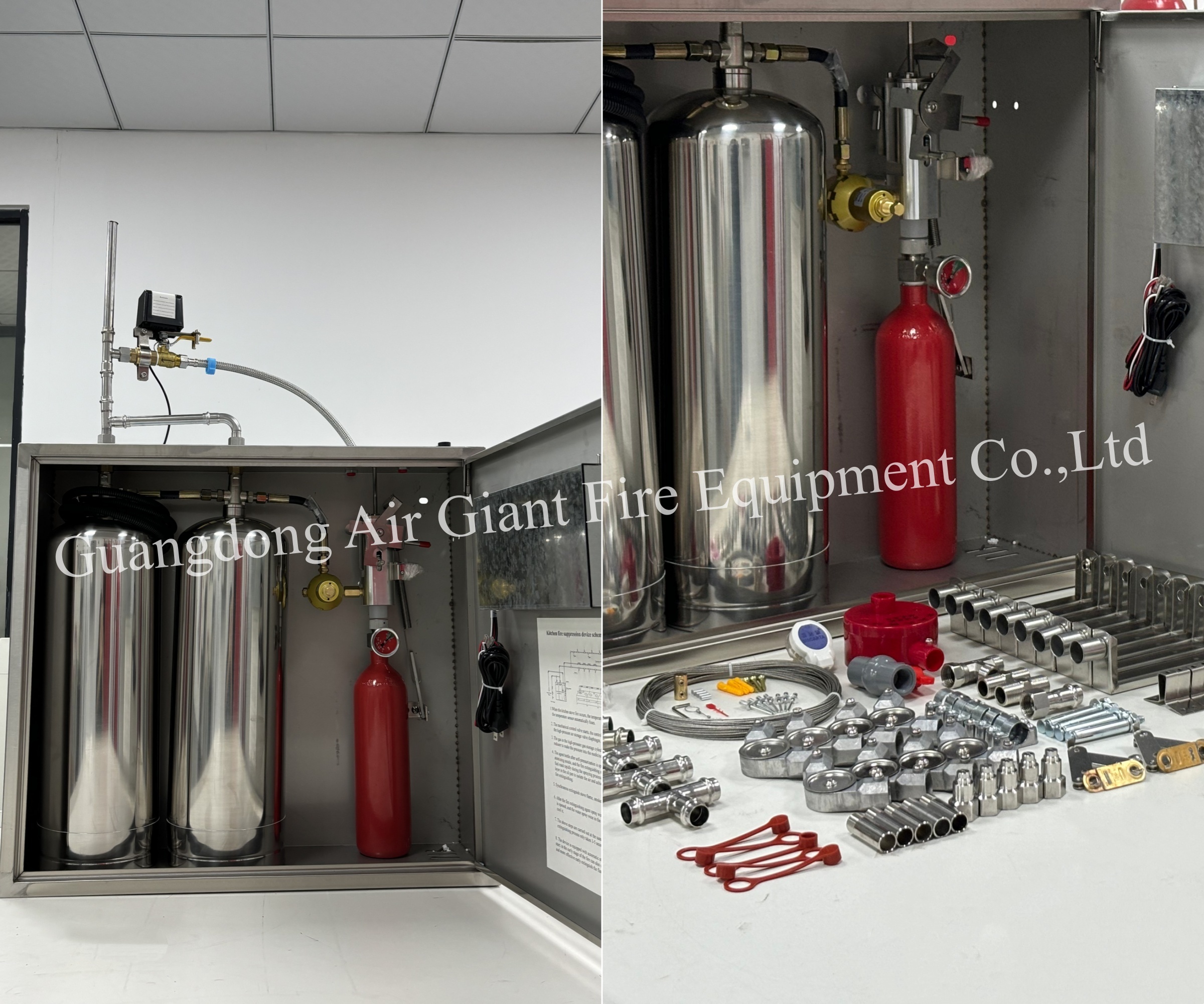 Устройство пожаротушения кухонного оборудования представляет собой полный набор устройств, устанавливаемых в условиях повышенной влажности и тепла, таких как промышленные кухни, коммерческие кухни и гражданские кухни, в том числе: